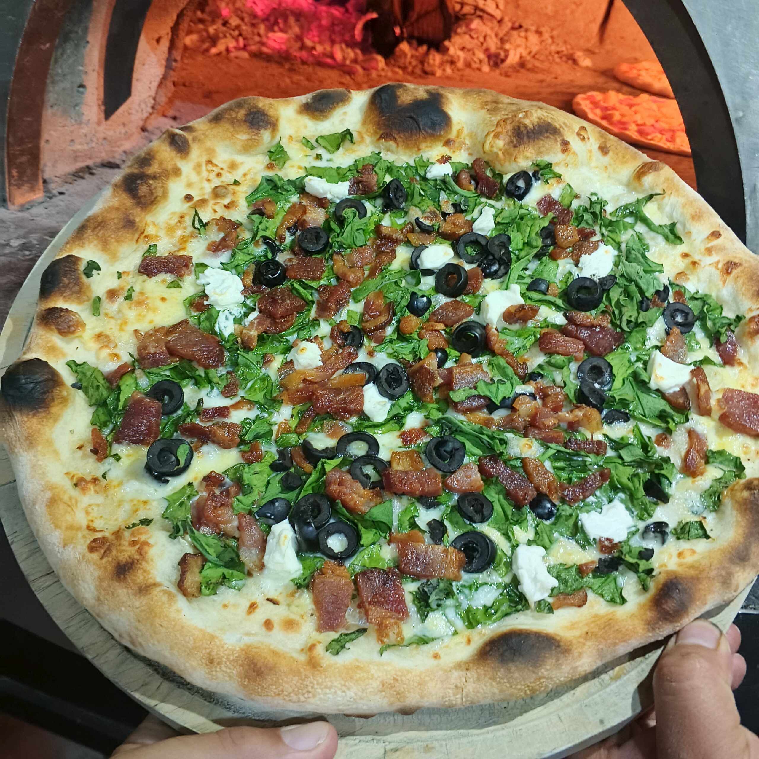 Base de olivo, mozzarella, espinacas, tocino ahumado, queso cremoso y aceitunas negras